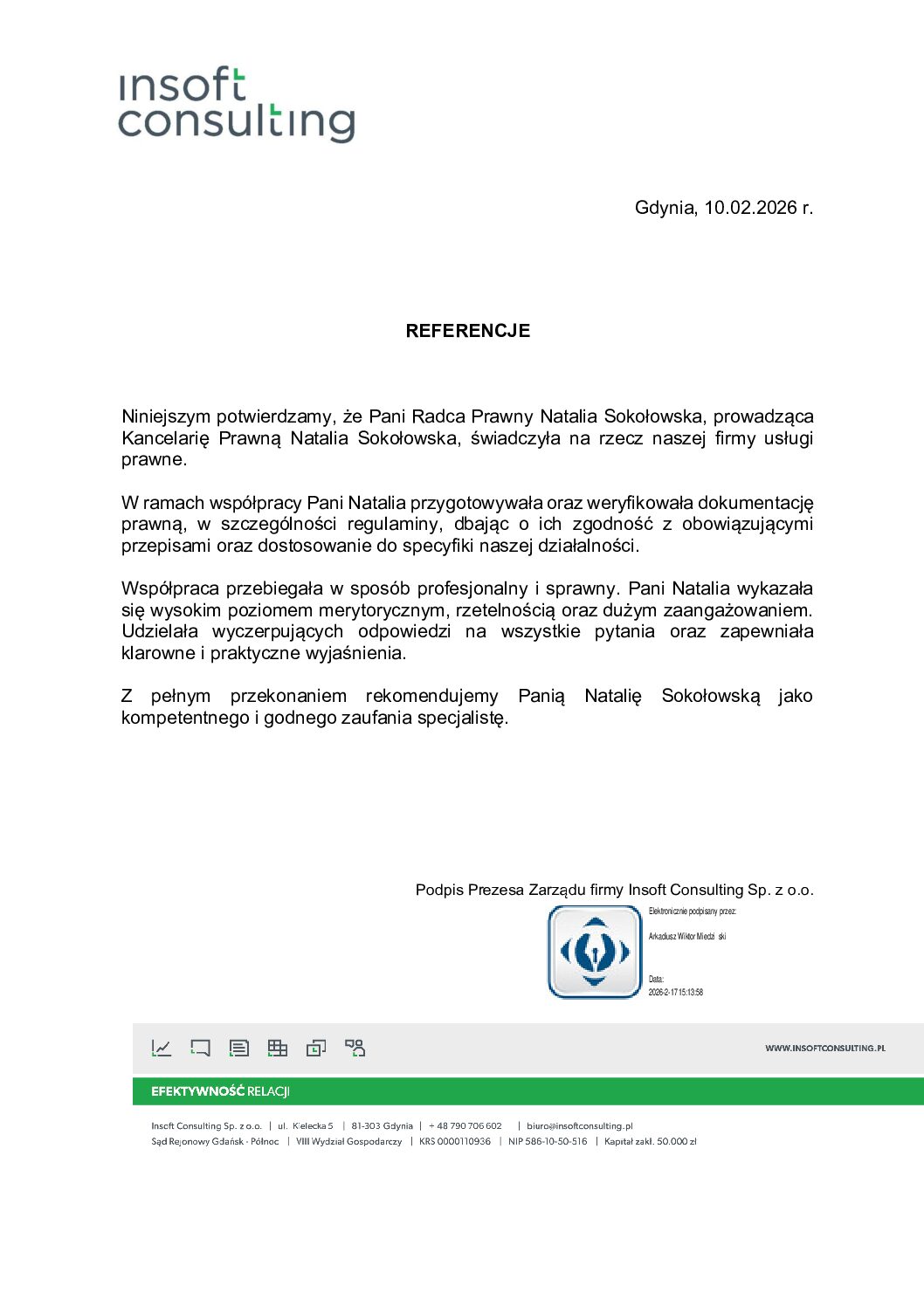 W ramach współpracy odpowiadałam za weryfikację dokumentacji prawnej Insoft Consulting Sp. z o.o. Moje działania obejmowały w szczególności analizę i weryfikację regulaminów pod kątem zgodności z obowiązującymi przepisami prawa oraz dostosowanie treści dokumentów do specyfiki działalności Insoft Consulting Sp. z o.o. Kluczowym elementem realizacji zlecenia było zapewnienie pełnej spójności dokumentów zarówno z aktualnym stanem prawnym, jak i z modelem biznesowym spółki.